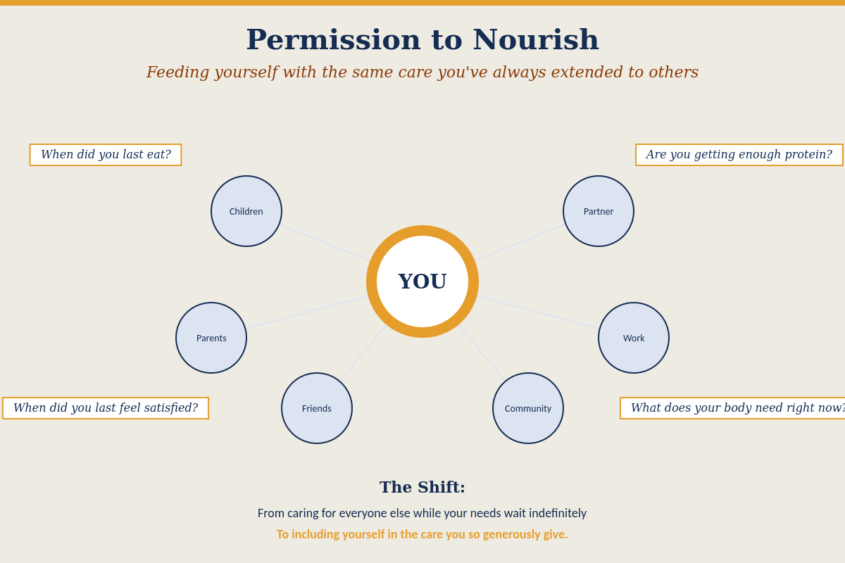 This disconnection from their own eating reflects years of training the nervous system to prioritize others' needs over one's own, and it manifests in the body as a loss of connection to basic signals. The hunger and fullness cues never stopped arriving, but the constant noise of others' demands made those signals easy to ignore until ignoring them became automatic, which is why so many women describe feeling completely out of touch with their own appetite by the time they reach midlife. Reconnecting with those signals requires attention, practice, and permission. Permission to notice what you need. Permission to respond to that noticing by actually eating. Permission to feed yourself with the same care you've always extended to everyone else in your life.