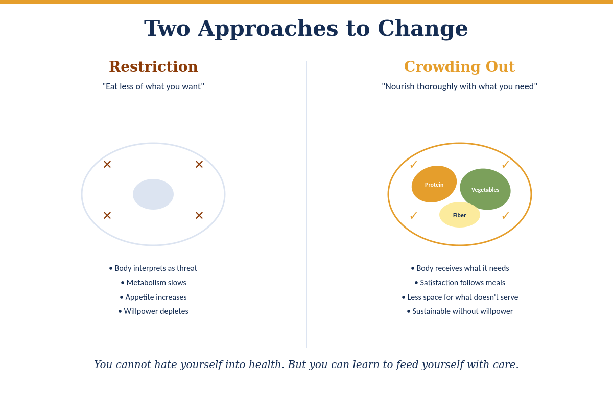 Crowding out is straightforward: nourish yourself well and regularly with what your body actually needs, so that there's naturally less space for what doesn't serve you, which means you're adding rather than subtracting. When you prioritize enough food at breakfast, you don't need to ban carbohydrates or swear off the foods you enjoy; you simply find yourself satisfied through your 10 AM meeting in a way that makes the vending machine less compelling because you're genuinely not hungry. When you fill half your plate with vegetables, you're leaving less room for options that would leave you hungry again in an hour, and the math of your plate shifts without requiring deprivation or heroic self-denial.