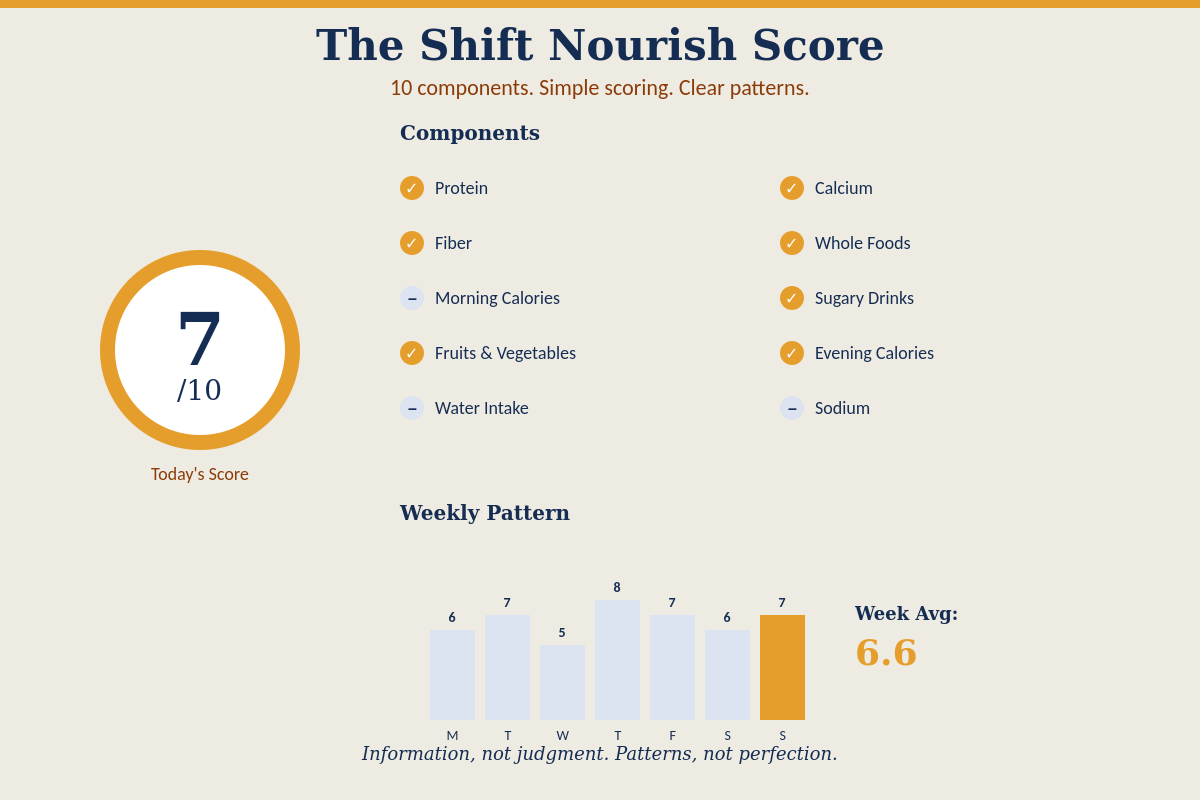 Each component is scored as either zero or one, so you either met the threshold or you didn't, with no weighted averages, no complicated formulas, and no numbers requiring a calculator to interpret. I made this choice because I've watched too many patients get lost in optimization, adjusting and recalculating and tweaking until the tracking itself becomes another source of stress that crowds out everything else they're trying to accomplish. A compass tells you which direction you're facing without demanding that you calculate your precise longitude, and the Shift Nourish Score works the same way: quick orientation that tells you where you are, with enough specificity to be useful and enough simplicity to avoid overwhelm.